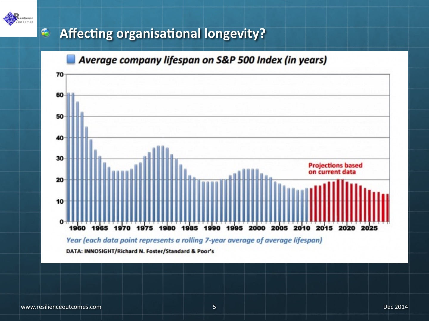 This graph produced by Innosight plots the average company lifespan on the USA Standard and Poor’s company index from 1958 to 2012 and extrapolates this out to 2030.