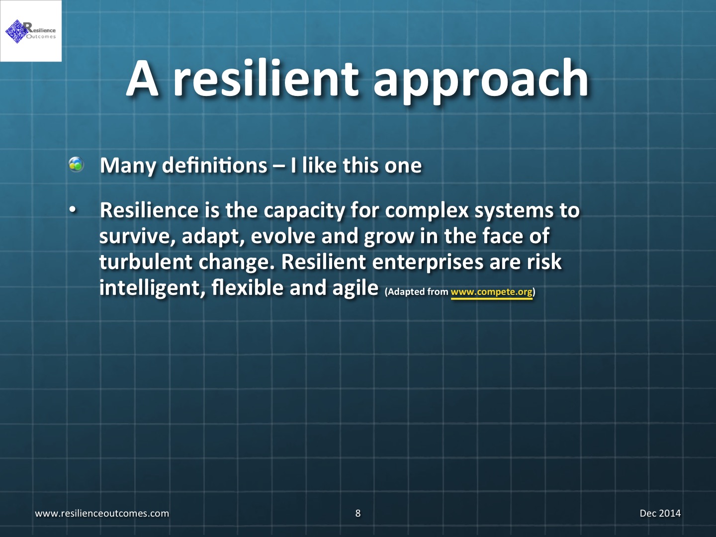 Resilience is the capacity for complex systems to survive, adapt, evolve and grow in the face of turbulent change. Resilient enterprises are risk intelligent, flexible and agile