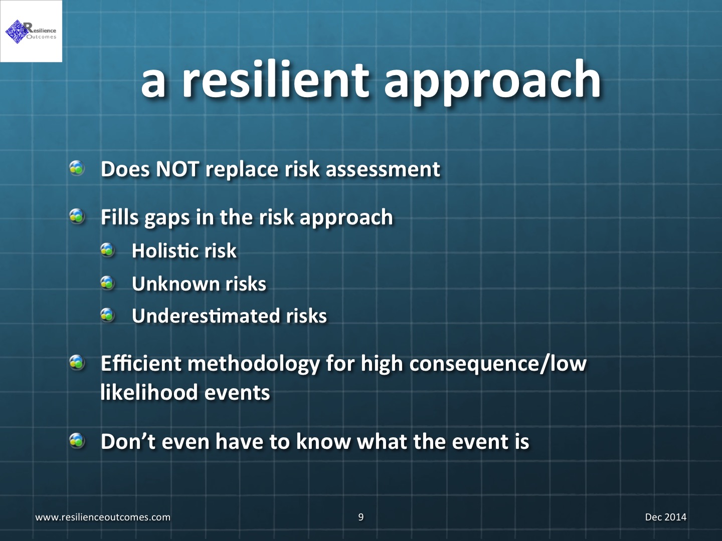 Resilience approach allows enterprises to put in place mechanisms ‘deal with the gaps’ in the risk approach – those things that have been missed or underestimated.