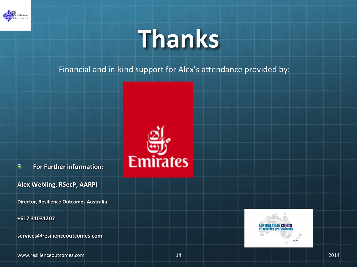 Resilience Outcomes would like to acknowledge the assistance of Emirates Airlines for getting Alex to and from Singapore in great comfort.